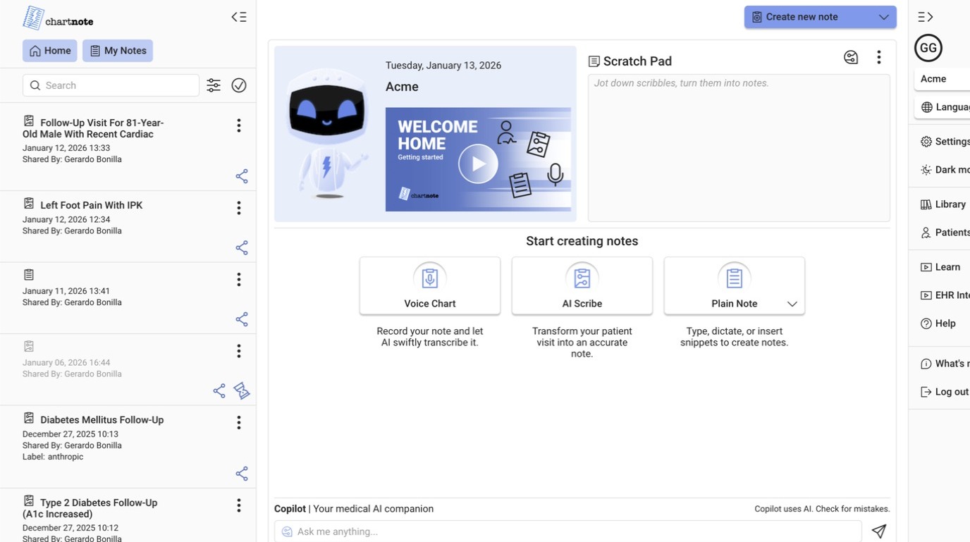 The Chartnote Doc Wizard helps clinicians create better, faster clinical notes by turning their ideal note style into a smart, personalized template. Just share your specialty and a sample note, and the Doc Wizard will figure out your format, style, ...