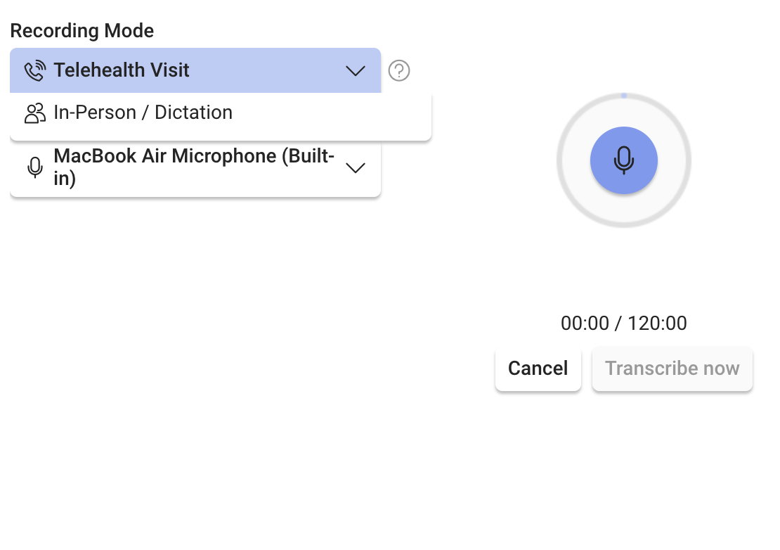 Chartnote’s AI Scribe supports two recording modes so you can capture high-quality audio whether you’re seeing patients in the office or meeting remotely over telehealth.