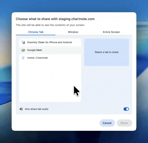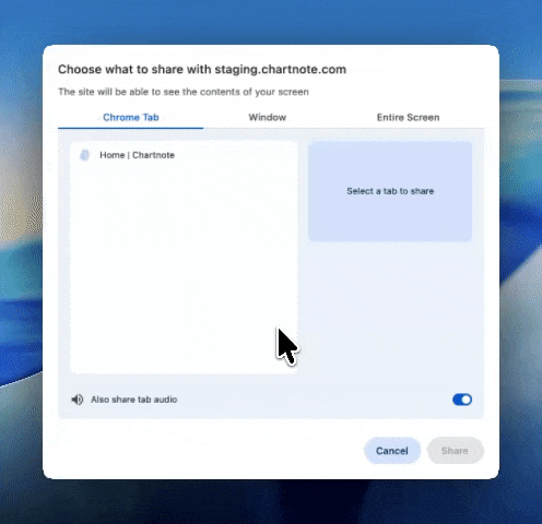When you select Telehealth Visit, Chartnote will prompt you to share audio. The correct option depends on how your telehealth visit is running.